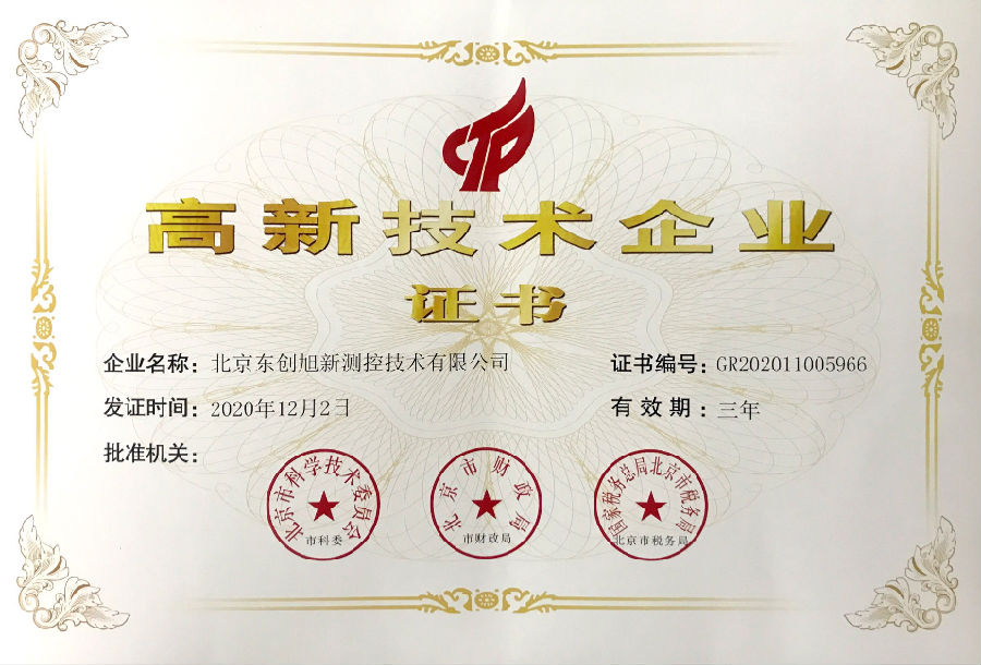 北京东创旭新测控技术有限公司于2020年12月,再次成功通过国家高新技术企业认定。近日已收到由北京市科学技术委员会、北京市财政局、国家税务总局北京市税务局联合颁发的《高新技术企业证书》。本次通过高新技术企业认定,是有关部门对公司技术实力及研发创新能力的充分肯定,是公司品牌价值和综合竞争力的反映。